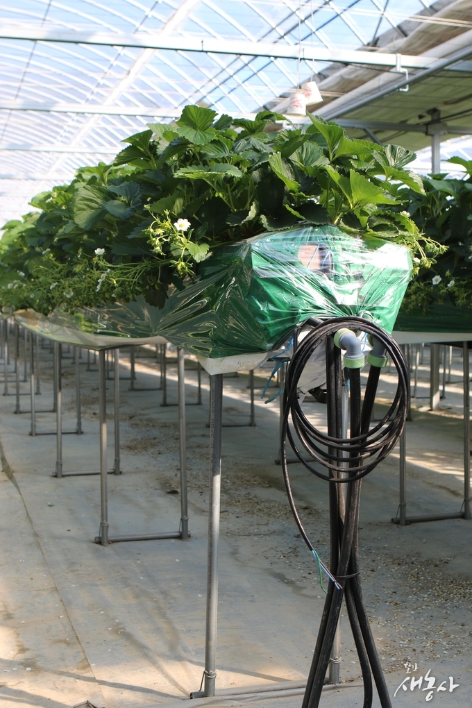 딸기를 재배하는 연동형 시설하우스는 570평으로 무인방제기, 보온커튼 등을 갖추고 있다. 천창과 측창은 설정해 둔 온도와 시간에 따라 자동으로 열리고 닫히며 환기할 수 있다. 현재 완성형 스마트팜으로 가는 과도기 수준이다. 고설베드에선 양액을 공급해 딸기를 수경재배하고 있다. 베드엔 열선을 설치해 배지 온도를 관리하고 있다.