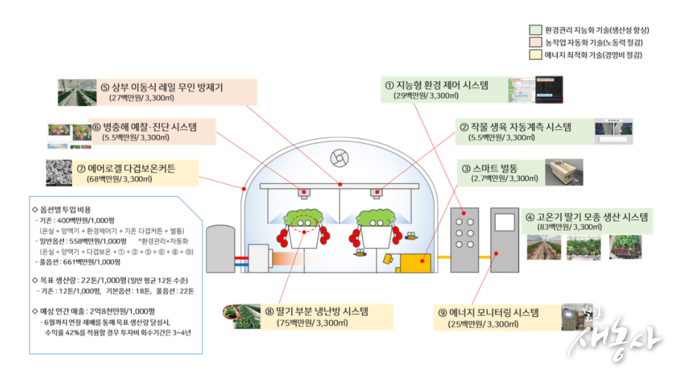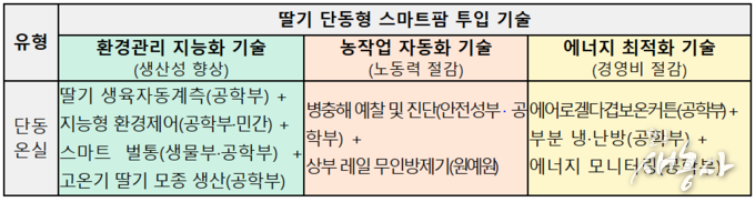 딸기 농사에선 가격이 더 높은 겨울철 생산이 효율적이다. 이땐 시설 환경관리로 1·2 화방의 출뢰(꽃대 출현)와 첫 수확 시기를 앞당겨야 한다. 융합 모형에 포함된 고온기 딸기 냉방 육묘 기술과 딸기 부분 냉방 시스템은 여름철 고온 피해를 줄이고, 인공지능 기반 환경관리 기술은 겨울철에도 온도, 이산화탄소(CO₂), 관수를 적절하게 관리할 수 있게 해준다.