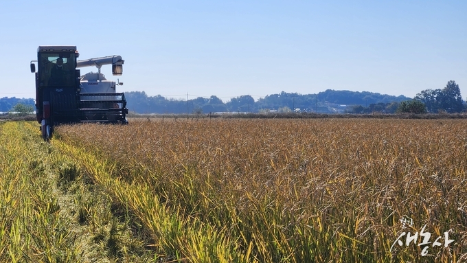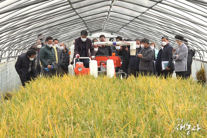 기술원은 생육 기간이 짧고 재생력이 강한 ‘빠르미’를 활용하면 국내에서도 움벼 재배가 가능하다고 기대해 왔다. 대규모 움벼 재배 가능성 확인을 위해 실시한 이번 현장 실증은 홍성군 서부면 3만 ㎡, 당진군 송악면 4만 5,000㎡의 논에서 진행 중이다. 5월 상순 모내기 뒤, 80여 일 만인 8월 상순 1차 수확을 하고, 밑동을 그대로 두고 재생시켜 10월 하순 2차 수확에 나섰다.
