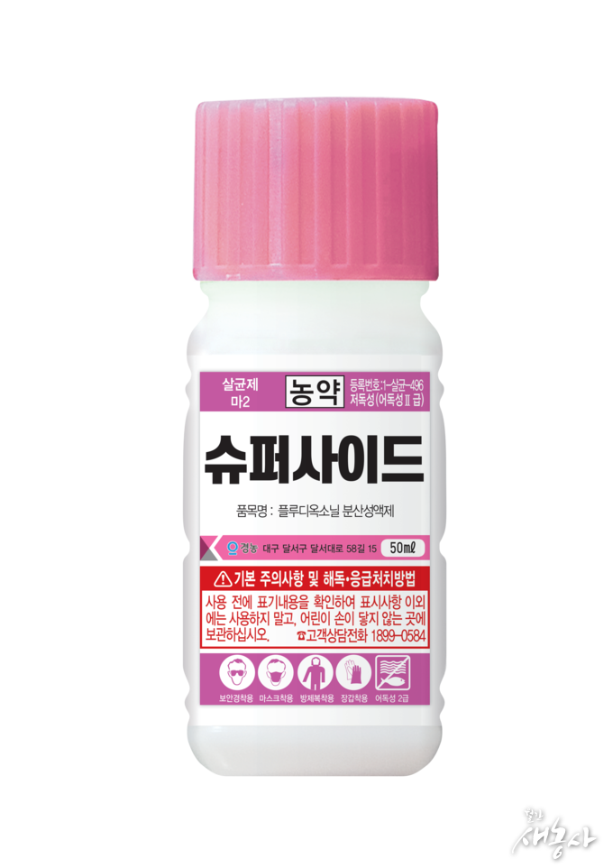 ‘슈퍼사이드’는 분산성액제 제형으로 작물 표면 확산성이 뛰어나 약효가 안정적이다. 2차 전염원에 대한 방제효과가 우수한 살균제로, 병반 확산을 신속히 억제하는 데 강점이 있다. 딸기, 복숭아, 오이 등 시설‧과수 작물에 효과가 우수하며, 병원균의 균사 및 포자의 발아~생장을 효과적으로 방제해 다방면으로 사용이 가능한 전문 살균제다.