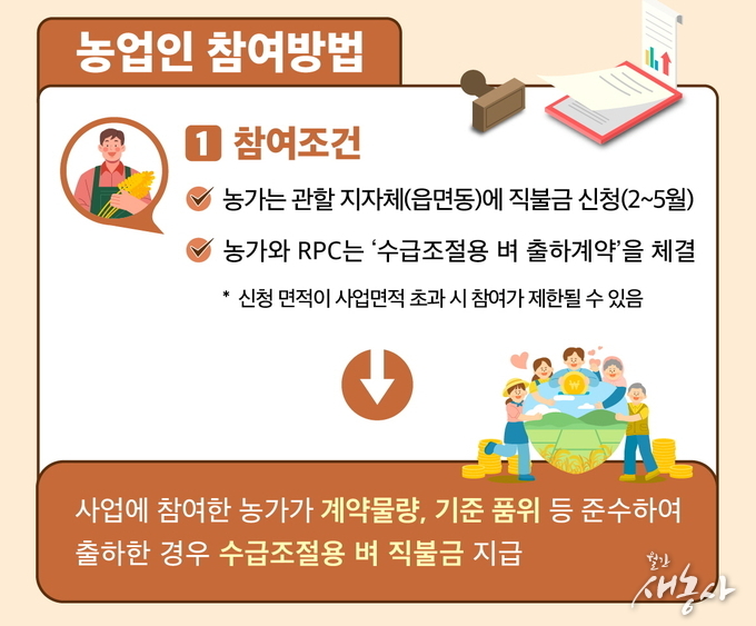 ‘수급조절용 벼 사업’은 2월부터 본격적으로 시작된다. 참여를 원하는 농가는 신청서를 2월부터 5월까지 읍‧면‧동에 제출하고, RPC와 계약 물량과 참여 면적 등 출하 계약을 맺으면 신청이 완료된다. 「공익직불법」 상의 적법한 농지와 농업인 자격을 갖추고 있고, RPC에 정상적으로 계약물량을 출하한 농업인은 지자체로부터 직불금(500만 원/ha)을, RPC로부터 가공용 쌀 출하대금(1,200원/kg, 정곡기준)을 연내에 지급받게 된다. 올해 참여한 농업인은 내년에도 수급조절용 벼에 참여할 수 있는 우선권을 부여할 계획이다.