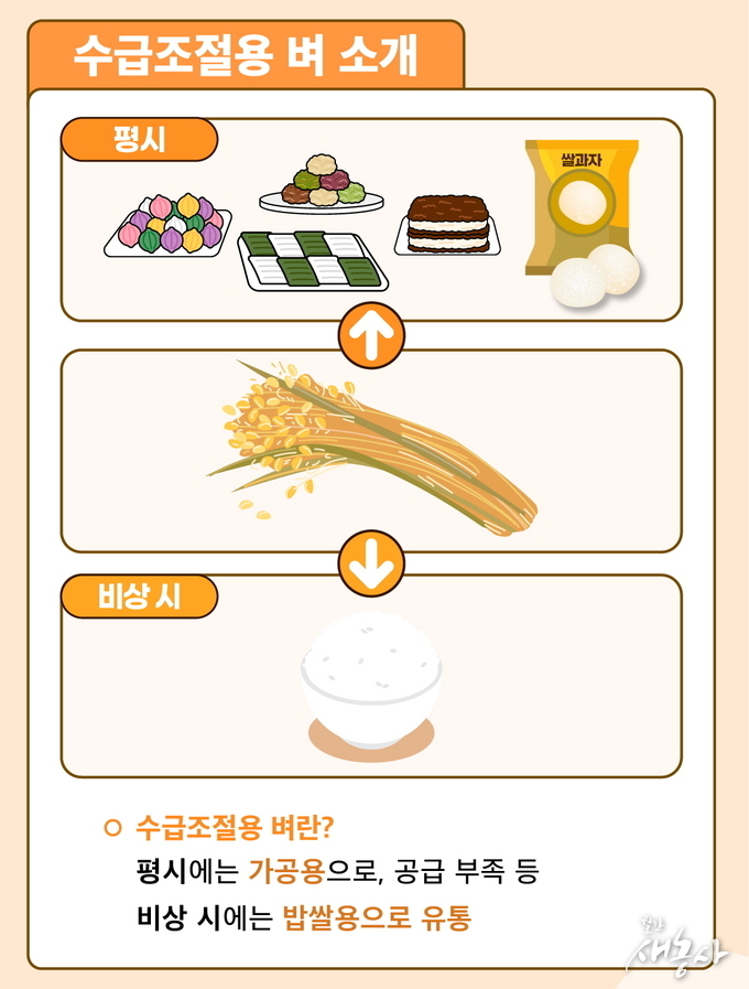 ‘수급조절용 벼’는 콩, 가루쌀 등 다른 작물의 추가적인 과잉 우려 없이 밥쌀 재배면적을 감축시켜 쌀 수급 안정에 큰 도움을 줄 것으로 기대된다. 또한, 수확기에 흉작 등으로 공급부족을 전망하면 수급조절용 벼의 용도를 가공용에서 밥쌀용으로 전환(용도제한 해제)하여 단기적인 수급불안에 신속하게 대응할 수 있다.
