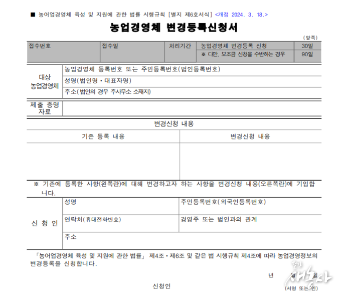 농업·농촌에 관련된 융자·보조금을 지원받으려는 농업경영체는 「농어업경영체 육성 및 지원에 관한 법률」에서 지정한 정보를 등록하여야 하고, 변경된 경우에도 변경등록을 신고해야 한다.