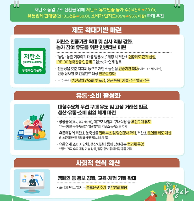 농림축산식품부(장관 송미령)는 저탄소 농축산물 인증 확대, 유통․소비 활성화 및 소비자 인식 개선을 주요 내용으로 하는 ‘저탄소 농축산물 인증‧유통 활성화 방안’을 마련하고 적극적으로 추진한다고 10월 1일 밝혔다.