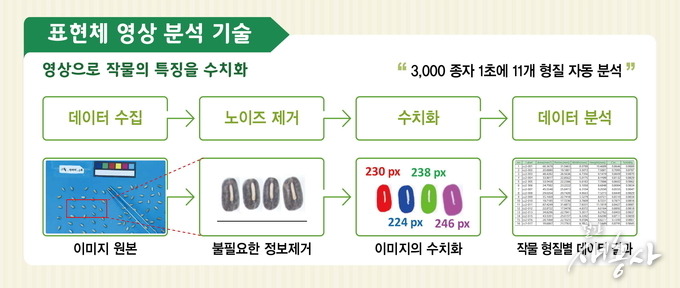 기술은 작물의 형태, 색상, 생육 등 생체정보를 영상 장비로 측정하여 자동으로 수치화한다. 기존에 사람이 할 땐 종자 한 개의 크기, 색상, 모양, 표면 질감 등 11가지 특성 분석에 걸리는 시간이 5분이었지만, 표현체 영상분석 기술은 1초가 걸린다. 4만 개 종자 분석 시 4명이 40일간 하던 일을 1명이 1일 만에 할 수 있다. 분석 정확도는 97%로 세계 최고 수준이다. 특히 농진청의 표현체 영상분석 기술은 스마트폰·카메라만으로도 가능해 고가 장비가 필요한 해외 기술보다 경쟁력이 세다.