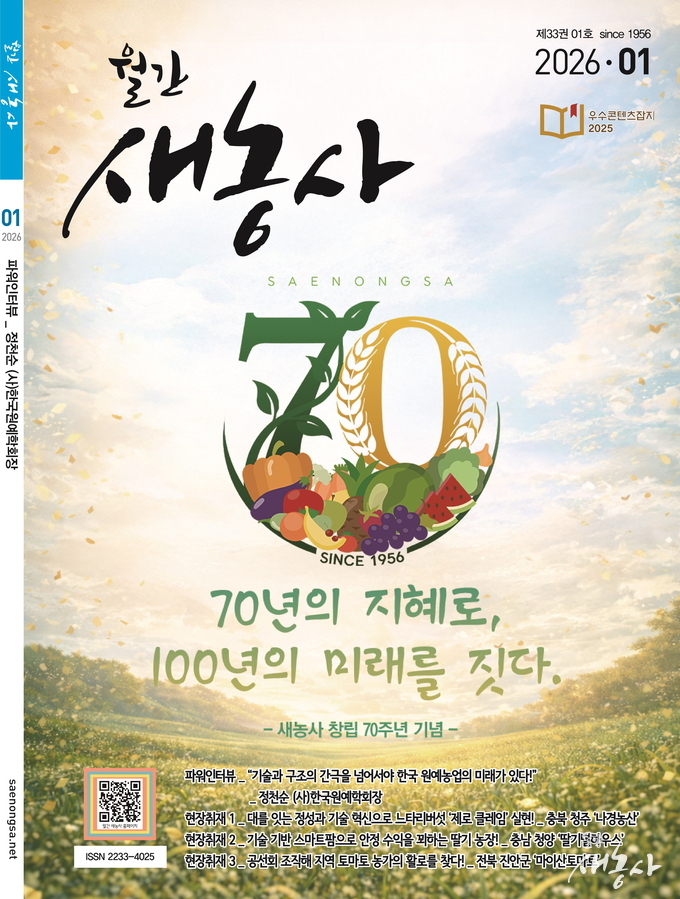 「월간 새농사」가 창간 70주년을 맞이한 2026년 힘찬 붉은 말의 해, 병오년(丙午年)의 태양이 떠올랐습니다. 지난 70년간 우리 농업과 농촌을 아껴주시는 국민 여러분, 그리고 존경하는 농업인 여러분과 농업 관계기관·단체 직원 여러분이 있어 「월간 새농사」가 올바른 언론으로서 나아가도록 큰 도움을 받았습니다. 감사합니다.