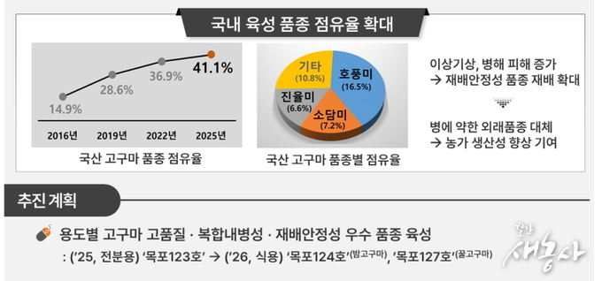 농촌진흥청(청장 이승돈)은 우수 품종 보급 확대로 국산 고구마 품종 점유율이 2016년 14.9%에서 2025년 41.1%로 상승했다고 지난해 12월 1일 밝혔다. 같은 기간 재배면적도 2,548ha에서 7,151ha로 약 2.8배 늘어났다.