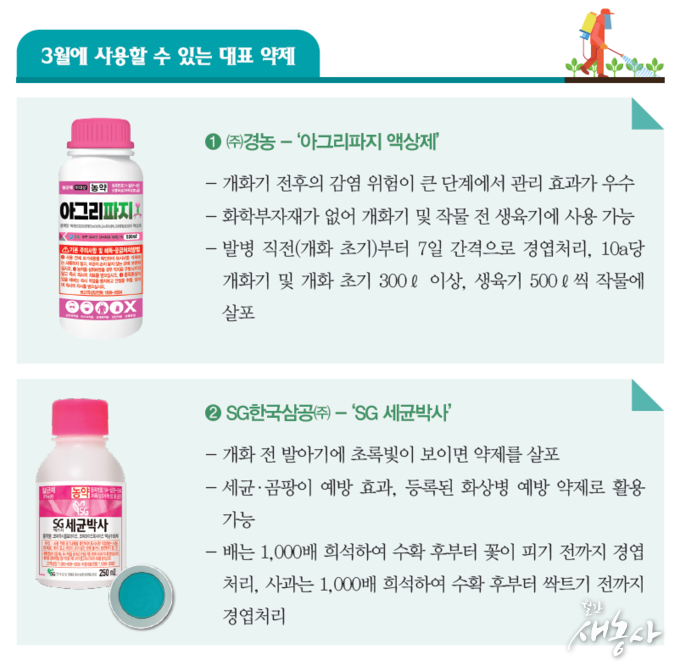 이달의 질문: “사과와 배를 재배할 때 3월쯤에 과수화상병 방제하는 방법을 자세하게 알려줘. 구체적인 약제 상표와 정보도 알려줘.”