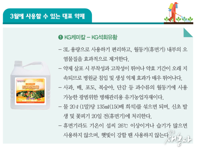 이달의 질문: “포도를 재배하면서 월동 중인 병해충을 잡기 위해 3월에 석회유황합제를 사용하려는데, 주요 제품과 특징, 사용법을 알려줘.”