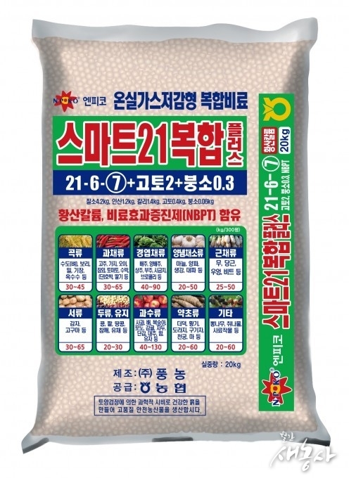 ‘엔피코 스마트21복합플러스 비료’는 시비 후 효과 빠른 3요소와 고토, 붕소 및 농경지 온실가스 발생 저감과 양분 이용률 향상에 효과적인 발명특허 기능성 비료효과증진제(NBPT) 함유 친환경 비료다.