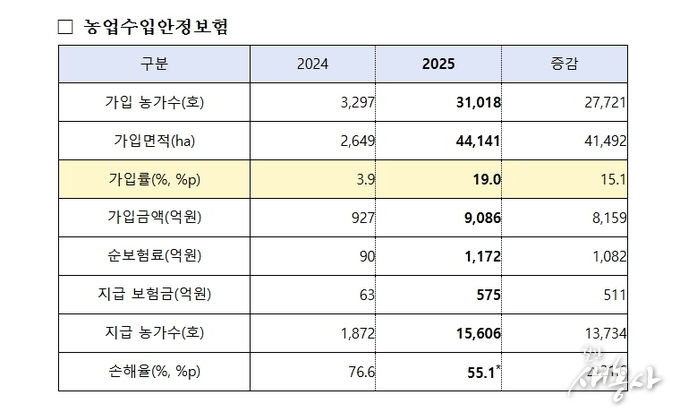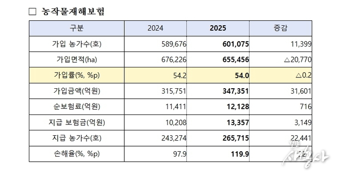2026년 농작물보험은 우선 사각지대 최소화를 위해 대상 품목과 지역을 확대한다. 농작물재해보험엔 오이, 시설깻잎 품목을 추가한 78개, 농업수입안정보험은 사과, 배, 노지대파, 시설대파, 시설수박을 추가한 20개를 운영할 예정이다. 특히 농업수입안정보험은 지난해 운영했던 15개 품목 중 벼를 제외한 14개 품목을 전국 대상으로 운영한다.