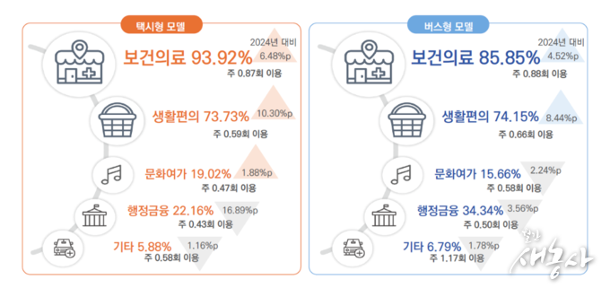 이번 조사 결과에 따르면, 택시형 이용자는 주로 병원, 약국 등 보건・의료시설 이용을 위한 단일 목적으로 교통모델을 이용하였다. 버스형은 보건・의료시설 외 장터, 마트, 관공서 등 여러 시설 방문을 목적으로 이용한 것으로 조사되었다. 또한, 버스형의 경우 주민이 원하는 시간에 원하는 곳으로 이동 가능한 콜버스 형태의 ‘수요응답형 버스’도 전년보다 증가한 17곳에서 운영되었다. 이는 단순히 운행 규모를 확대하는 것에 그치지 않고, 주민들의 실제 생활 동선과 수요에 맞춘 서비스 내실화에 집중한 결과로 분석된다.
