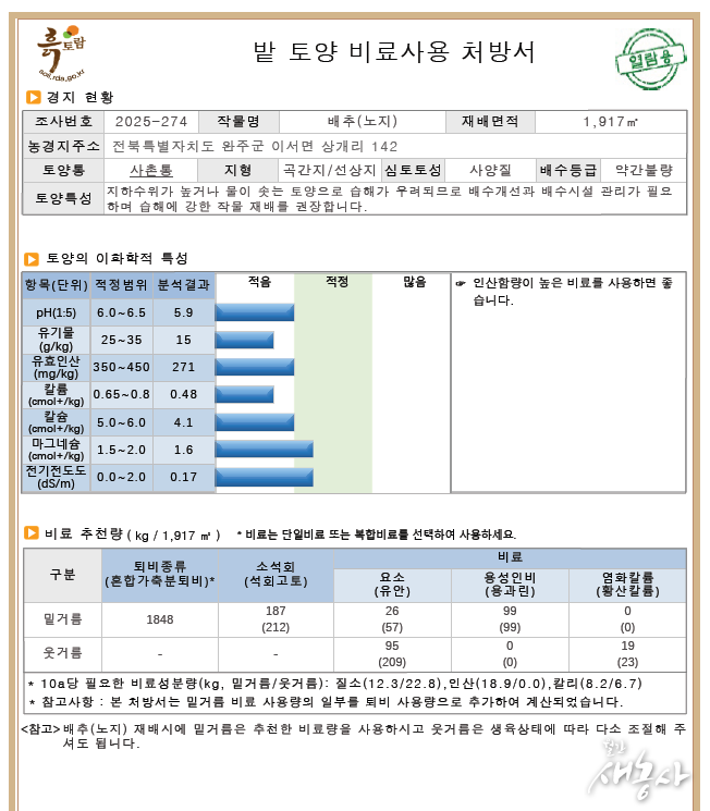 농진청은 토양환경정보시스템 ‘흙토람(soil.rda.go.kr)’에서 246개 작물의 비료사용 처방서를 제공하고 있다. 작물을 아주심기(정식) 하기 전 토양을 채취해 가까운 농업기술센터에 분석을 의뢰하면 토양 양분 상태에 맞는 퇴비와 액비 사용량을 알려준다. 또한, 농가가 안심하고 퇴비, 액비를 사용할 수 있도록 농업기술센터에서 자가 퇴비의 부숙도와 액비 성분을 분석해 알려주고 있다.