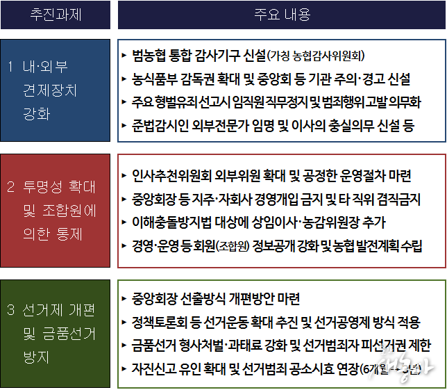 정부는 이번 감사 결과를 토대로 농협 개혁 방안을 마련 중이다. 핵심 방향은 ▲중앙회 권한 분산 ▲외부 감시 강화 ▲선거제도 개선 ▲재정 운용 투명성 제고 등으로 요약된다. 특히 국무조정실, 금융당국 등 범정부 차원의 개입을 통해 기존 농협 내부 중심의 개혁 한계를 극복하겠다는 의지를 반영했다.